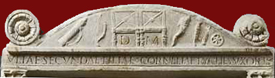 Above the portrait busts the monument is topped by volutes on either side of a curved shape whose inner space is closely carved on two levels. The lower "frieze" level contains the names of the deceased illuminated in red, each name identifying the woman below, with an ivy leaf between them. In the center of the upper "pediment" level stand two empty chairs in relief, with the letters D and M carved and illuminated under each seat. To the left of the chairs are a quiver and bow, symbols of the virgin goddess Artemis/Diana, who is frequently pictured on sepulchral monuments of young girls (also see Wood in Bibliography). To the right of the chairs in relief are symbols associated with, appropriately, the goddess Tyche/Fortuna: a cornucopia, torch, rudder, and wheel.